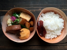 닭고기 흑당 생강 조림, 후키노토 고로케, 달걀 구이, 홍심 무의 유자 후추 마리네, 신인삼과 푸른의 후두 무늬, 미즈나 오히타시, 봄의 미각을 사용한 7종의 반찬에, 밥, 그리고 디저트에는 벚꽃 쿠키를