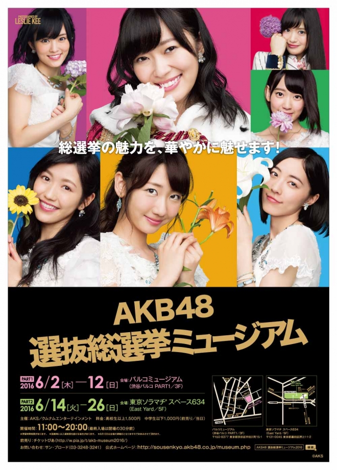 〈AKB48 45th 싱글 선발 총선거〉(개표: 6월 18일(토), 니가타·HARD OFF ECO 스타디움 니가타)를 기념한, 〈AKB48 선발 총선거 뮤지엄〉.4회째를 맞이하는 이번은 메인 회장을 2곳으로 확대해, 2016년 6월 2일(목)부터 6월 12일(일)까지 파르코 뮤지엄(시부야 파르코 PART1/3F), 2016년 6월 14일(일)까지 도쿄 소라마치 스페이스 634(도쿄 소라마치 EastYard/5F)에서 개최됩니다.