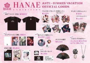 개인전 타이틀 「ANTI - SUMMER VACATION」의 아래 본 전시용으로 찍어내린 사진이나 시, 과거의 작품을 포함한 작품을 한꺼번에 본방 최초 공개!거기에 맞춘 본 개인전의 ZINE, 신작 T셔츠, 클리어 파일, 배지 등등에 더해 과거에 판매한 레어 상품, 그리고 이번에 무려 HANAE의 이미지를 바탕으로 제작한 수량 한정 스페셜 실버 액세서리의 판매도 결정!!